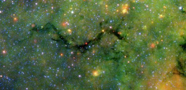 这条黑色裂缝的灰尘非常密集,即使人类可以乘坐太空船飞进黑色裂缝内部所能看到的也仅仅是一片漆黑,就连黑色裂缝外部发光的星体也无法看到。而斯皮策天文望远镜可以利用红外线穿过厚厚的裂缝灰尘层,为科学家提供黑色裂缝内部红外照片。从照片中我们可以看到,那些在黑色裂缝内部及周围呈现黄色及橘红色的斑点即为尚未成型的新星体。而那些发射着红色光芒的斑点即为恒星胚胎,其质量约为太阳的20至50倍。