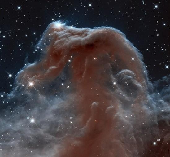 通过美国宇航局/欧洲航天局的哈勃太空望远镜,从近红外光范围看到的马头星云。这个浓密的气体、尘埃柱是被位于该图外的星空中的恒星簇产生的强大恒星风“雕琢”而成的。该星云左上方边缘处的光源是一颗年轻恒星,他产生的强辐射正在不断驱散周围的星际物质。