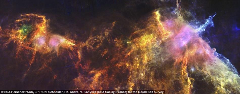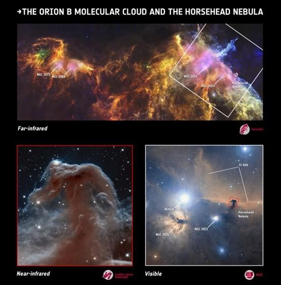 由3张图片组合在一起的这张图显示的是,最新拍摄到的马头星云的近红外光哈勃图,以及从远红外光范围拍摄到的该星云周围情景的宽视场赫歇尔图。