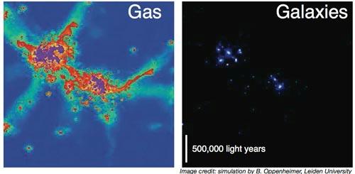 研究人员利用哈勃望远镜的两个紫外光谱仪(宇宙起源光谱仪和太空望远镜成像光谱仪),观察显示现代星系周围的气团中,有大量的冷气体,却只有极少量的重元素。重元素的缺乏表明,这种气体处于星系的“环星系介质”中,并未经过恒星的强烈加工。由于气体中原子能消除少量的光,当来自类星体的光穿过星系周围的气体时,化学元素就会留下带有特征光谱的“指纹”,天文学家就能凭此研究星系附近气体的理化性质。