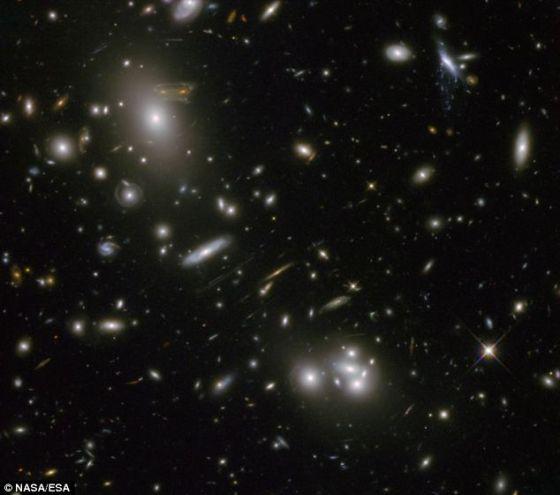 哈勃望远镜拍到的画面是一个太空版海市蜃楼,由前景星系团的引力场扭曲空间所致,导致背景中更为遥远的星系团发生扭曲。这种效应被称之为“引力透镜”,能够将来自遥远星系的光线进行多次镜像复制。