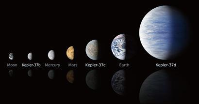 从左至右依次为月亮、开普勒-37b、水星、火星、开普勒-37c、地球和开普勒-37d。 新华社照片
