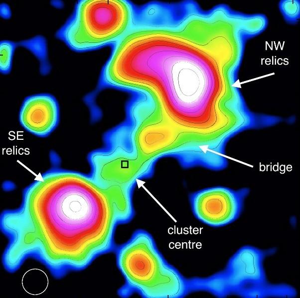 研究人员发现连接星系群外边缘和核心之间的气体尘埃发出漫射的无线电光芒。这个桥状连接结构长约1300万光年。卡雷蒂说道:“这是拍摄到的两个合并星系群产生巨大撞击的第一张清晰图像。我们观测的整体结构是一个巨型冲击波,以及星系碰撞产生的尾流。尾流其实是冲击波的残余物,后者会留下狂暴‘摇晃’的媒介。”冲击波以430万千米每小时的速度仍在不断扩张。