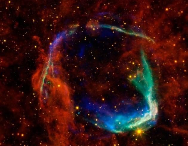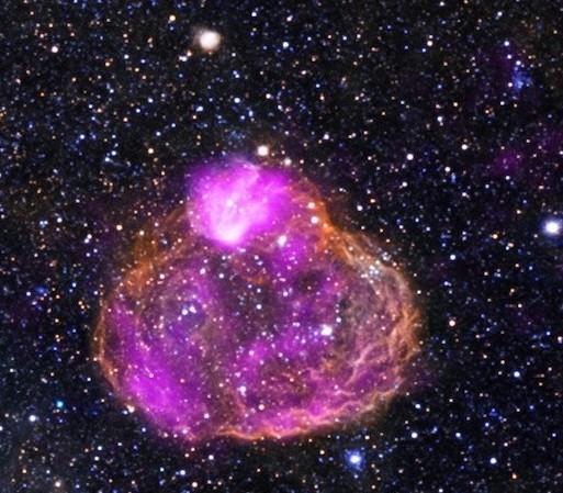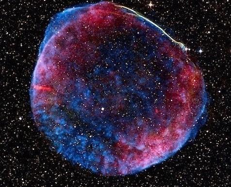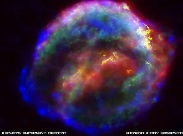 1604年发生了一次肉眼可见的超新星爆发事件,这次爆发也被天文学家开普勒观测到。这场剧烈的照亮天宇的爆发所留下的便是被编号为SN 1604的超新星遗迹,也被人们直接称作“开普勒超新星遗迹”。这张图像是综合美国宇航局三台工作于不同波段的望远镜数据的合成图像。