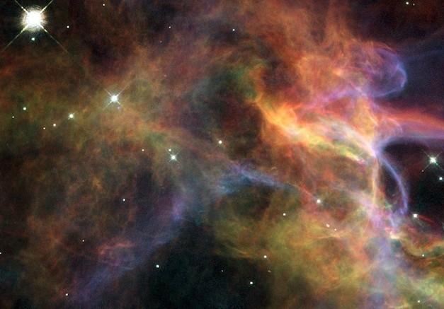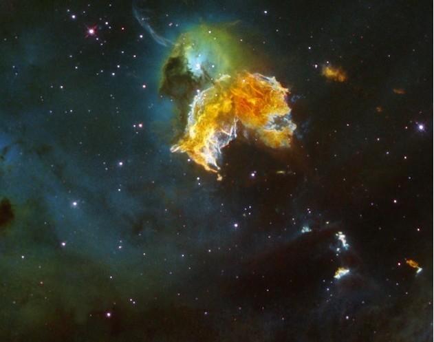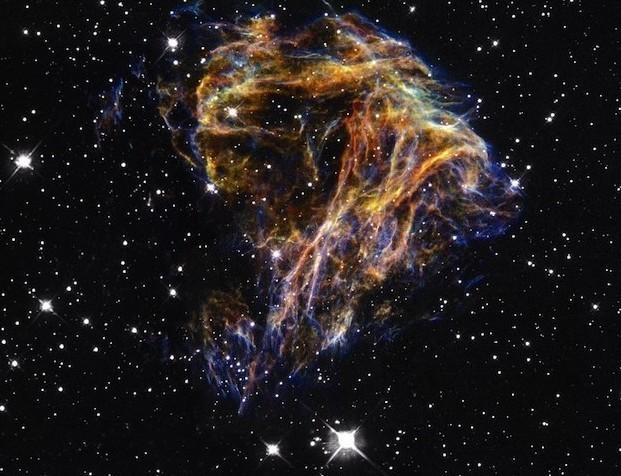 这个超新星遗迹名为N 63A。这是一场发生于16万光年外的一次超新星爆发留下的遗骸,大量尘埃和气体云四散飞溅。