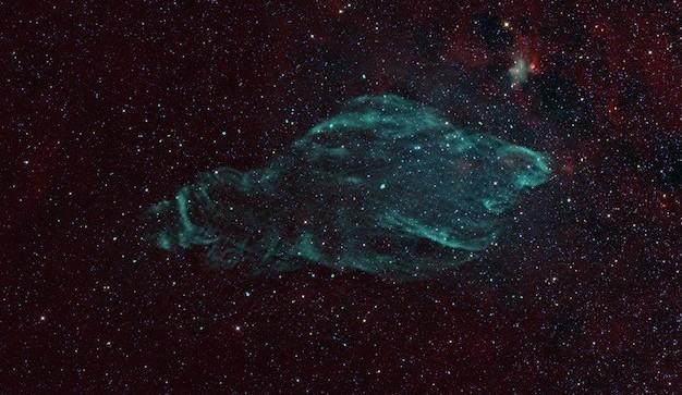 这是面纱星云,一片光辉的尘埃与气体云团。它是大约5000~10000年前的一次超新星爆发后遗留的产物,位于天鹅座,距离我们约1500光年。