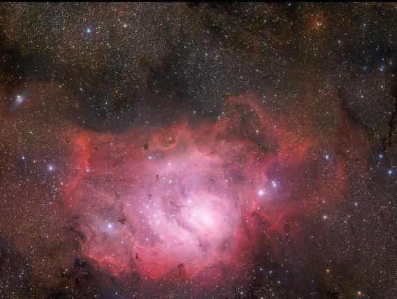 国外媒体近日发布了礁湖星云的壮观图片。这是欧洲南方天文台GigaGalaxy Zoom 计划拍摄的第三张照片,它利用位于智利拉西拉天文台口径2.2米的陆基MPG/ESO望远镜上拍摄。这架望远镜装备有6700万像素的宽视场成像仪,图片显示了礁湖星云壮观的远景。这张图片覆盖了至少1.5个平方度——大约是满月时整个区域的8倍大——约3.7亿像素。这张图片利用了3种不同的宽波段滤光器(B、V和R)和1个窄波段滤光器(H-alpha)。
