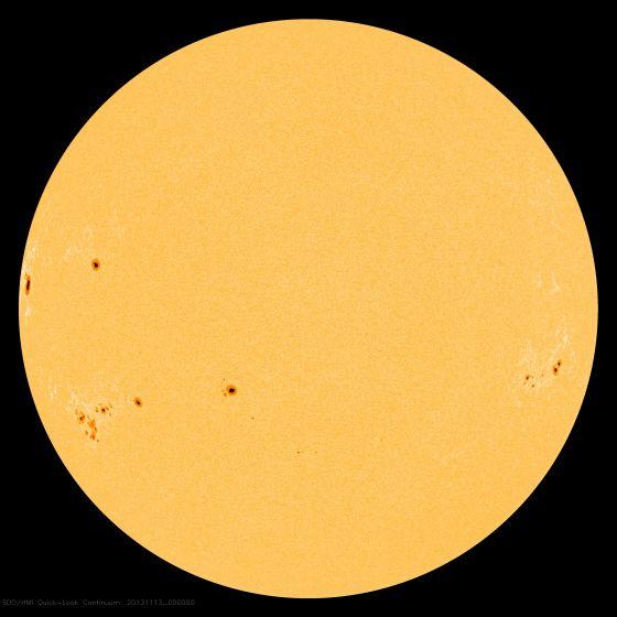 11月13日实际拍摄的太阳,可以看到明显的黑子(来自:SDO/HMI)