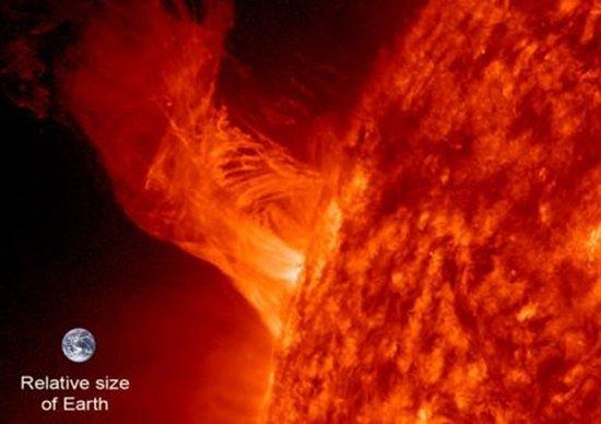 美国宇航局太阳动力学天文台拍摄的太阳物质回落照片,边上是地球的大小,其规模足以吞没数十个地球