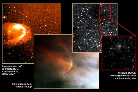由美国宇航局空间望远镜拍摄到高速运行的恒星周围出现“弓形激波”的情景