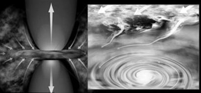 年轻恒星吸收周围环境物质进入旋转磁盘(右),产生巨大的物质喷射流(左)。