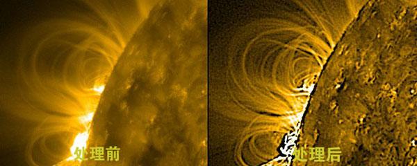 这是同一副图像经过梯度过滤技术处理的前后对比。我们可以从经过处理的图片中看到清晰的日冕环,这非常有利于进行精细的科学研究。