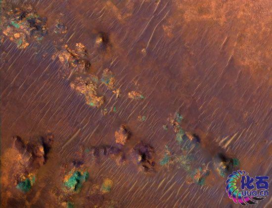新的发现指出,在火星上埋藏着大量的绿色矿石——橄榄石。橄榄石在玄武岩中很常见,并且是地球上层地幔的重要组成部分。虽然橄榄石在地球的表面很丰富,但它会在我们行星的相对温暖和潮湿的条件下迅速风化。根据橄榄石在如今是寒冷和干燥的火星表面暴露的时间长短,没有风化的橄榄石的存在将提供有关火星古气候的线索。利用安装在火星勘测者上的热辐射光谱仪提供的光谱数据,Todd M. Hoefen和同事们在火星上的Nili Fossae地区发现了富含橄榄石的岩石的露头。Nili Fossae一直被认为是一个与Isidis撞击盆地的形成有关的、充满了断层和断面的区域。作者们推测撞击后在这个地区出现断层的运动将富含橄榄石的地下岩层暴露了出来。