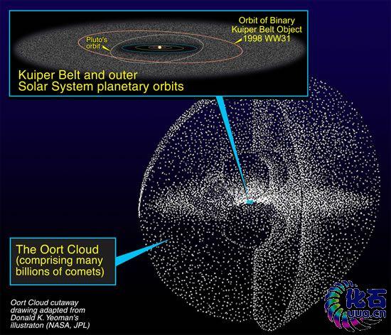 第一个Kuiper带天体是经过长时间寻找后才在10年前发现的。上个世界50年代, Gerard Kuiper 和 Kenneth Edgeworth预测,在海王星之外,有一个充满着小的、被冰覆盖的天体的区域。迄今为止,这些天体中我们知道的有近1000个,很多天文学家认为冥王星不是一个真正的行星,而是在其发现之前60年就被发现的一个 Kuiper带天体。关于太阳系中这些遥远天体的仍未解开的迷团之一是,在寒冷的 Kuiper带(由距太阳约50个天文单位(70亿公里)的低倾度轨道中的天体构成)中缺少物质材料,。Levison和Morbidelli开发出一个模型,可解释Kuiper带的形成,且与我们所观测到的情况是一致的。他们得出的结论是,整个Kuiper带当时形成时的位置要比其现在距太阳的距离更近,在行星形成过程的最后阶段被向外输送。寒冷的Kuiper带天体可能是在距太阳仅35个天文单位的地方开始其生命的,在那里有更多的物质材料来形成它们。