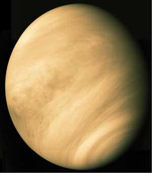 金星是距太阳的第二颗行星,它与地球在体积、质量、密度和重量上非常相似,可以算作是地球的姊妹星。而事实上金星与地球非常不同。金星上的一天相当于地球上的243天,而它的一年却只有225天。 金星的自东向西自转还使得太阳在金星上西升东落。金星有厚厚的二氧化碳的大气,没有水。它的云层是由硫酸微滴组成的。它的地表大气压是地球上的九十多倍。金星浓厚的二氧化碳大气造成强大的“温室效应”,太阳光能够透过大气将金星表面烤热,但地表辐射却受到大气的阻隔,热量无法得到释放,致使地表温度高达摄氏四百八十多度。这样高的温度使得金属都会熔化。
