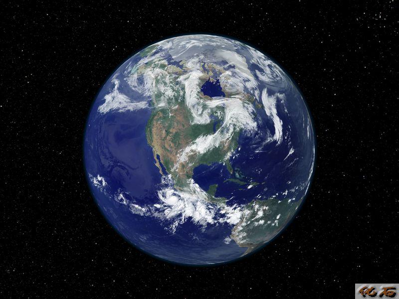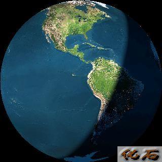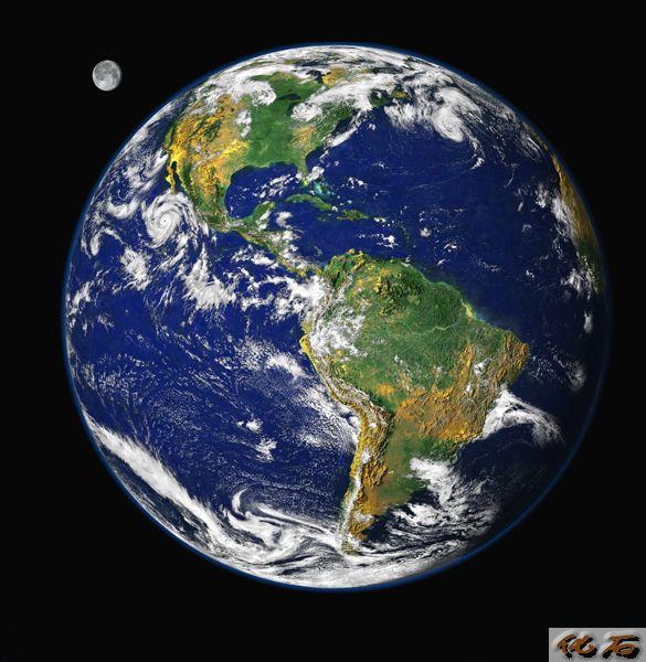 这是一张由卫星图片处理而成的地球与月球的图片。图中的大陆为北美洲和南美洲,左边是非洲的一部分。