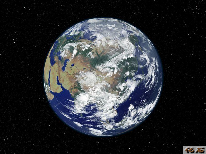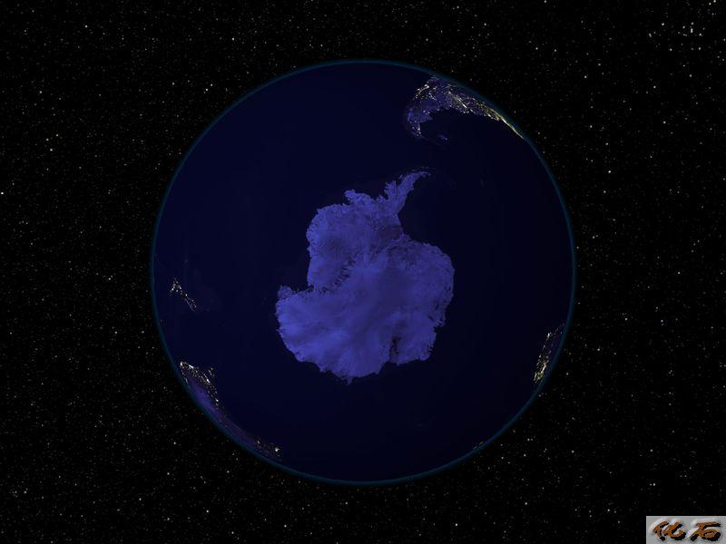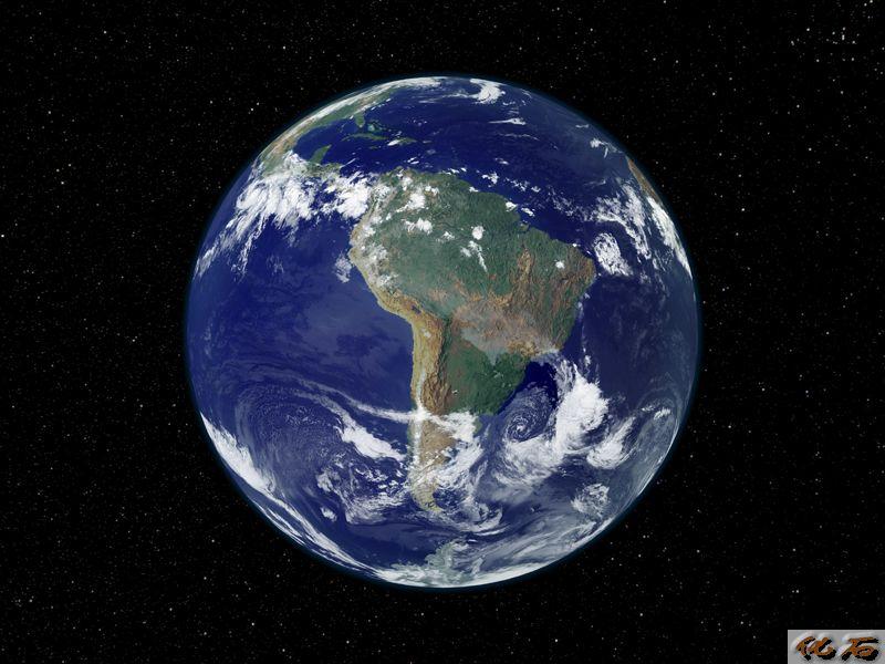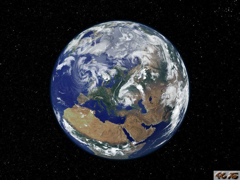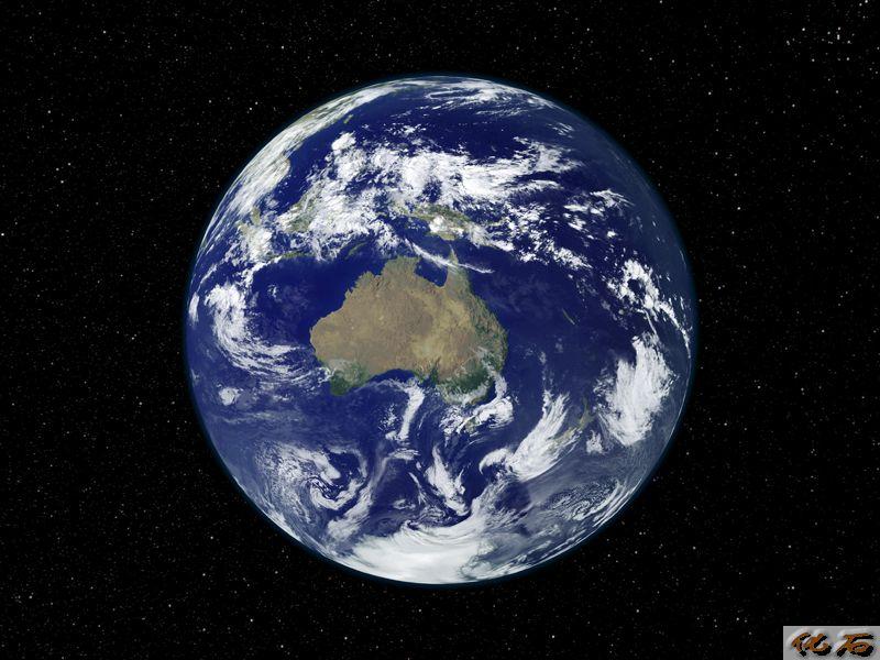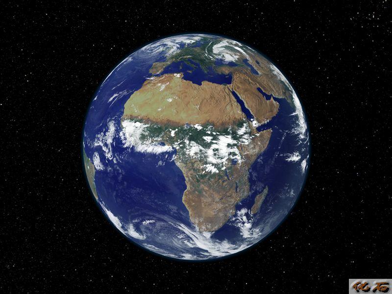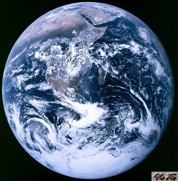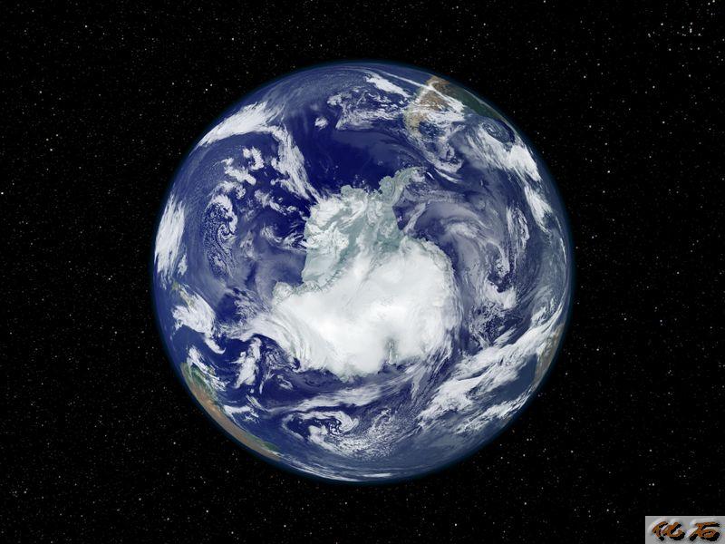 这是由卫星拍摄的地球图像。红褐色的是非洲和部分亚洲大陆,蓝色为海洋,白色团块为云,下部白色区域则是南极。