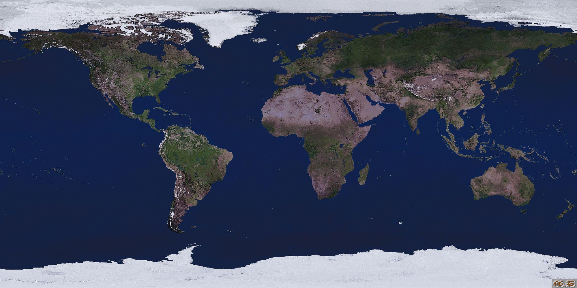 这是一张由卫星图片处理而成的高清晰世界地形图。我们可以从中看到高山、河流、湖泊、荒漠和森林。