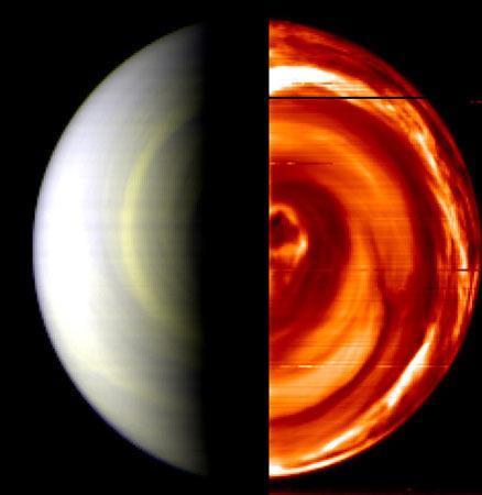 一张假彩色的“可见与红外热成像分光计”的合成图像左边显示的是金星的白天,右边显示的是金星的黑夜,每一个像素相当于50公里。引人入胜的黑夜一侧是由红外滤光片拍摄下来的,显示出在较低的大气层中有动态的盘旋云结构,这个结构的海拔高度约有55公里。更黑的地区被更厚的云层覆盖,而较为明亮的地区云层也较薄。
