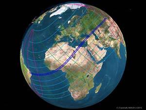 北京时间3月29日下午4时36分开始,地球上空出现日全蚀现象,从巴西东端、非洲北部、地中海、土耳其至俄罗斯和蒙古一线,依次看到这一天文奇观。整个狭长的路线有14500公里,覆盖了近半个地球。非洲北部三分之二的地区,欧洲和中亚的部分地区能看到日偏食。日食将在北京时间19时12分结束,历时3小时12分钟。利比亚将是这次日全食的最佳观测点,其次还有土耳其。