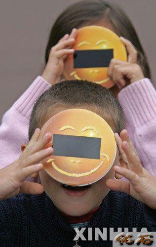 10月3日,两名儿童在法国科西嘉岛的巴斯蒂亚使用特制的太阳镜观看日环食。
