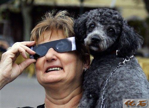 10月3日,在法国科西嘉岛的巴斯蒂亚,一名妇女通过特制的太阳镜观看日食。