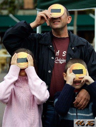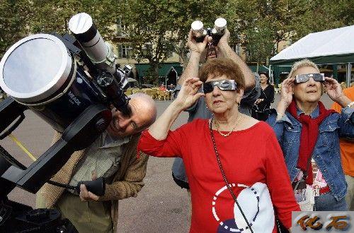 10月3日,在法国科西嘉岛的巴斯蒂亚,人们通过特制的太阳镜观看日食。