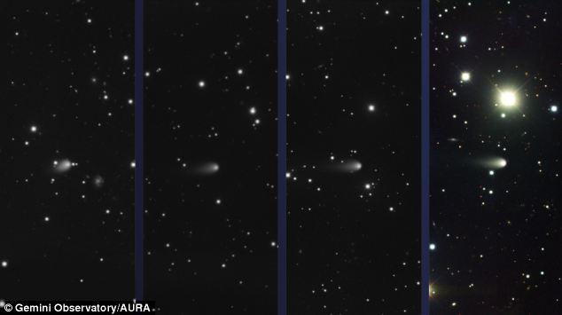 从左到右依次为,利用双子北座望远镜的双子座多目标光谱仪分别于2013年2月4日,3月4日,5月4日获得的彗星ISON图片。