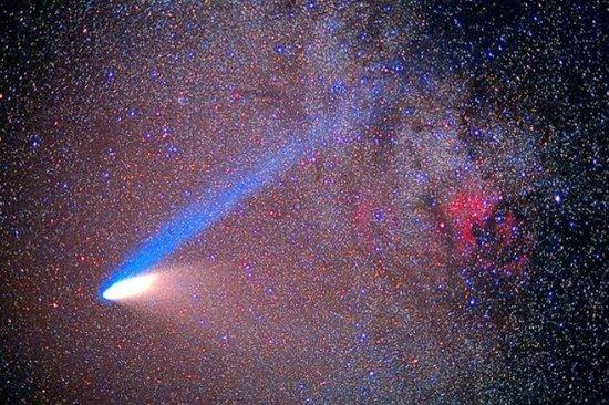 据国外媒体报道,海尔-波普彗星实际上一颗异常明亮的彗星,其亮度可能是哈雷彗星的数千倍,它于1997年4月抵达近日点,由于其体积庞大,至少在40公里以上,因此它的接近也给人们带来恐慌,比如当其进入太阳系内侧轨道时曾引发人们对外星人光临地球的猜想。海尔-波普彗星可能是历史上最受欢迎的彗星,根据NASA的观测记录,其拥有两条蓝色和白色的美丽“尾巴”,即便是在光污染比较严重的地区,我们也能很容易地看到它的身影。