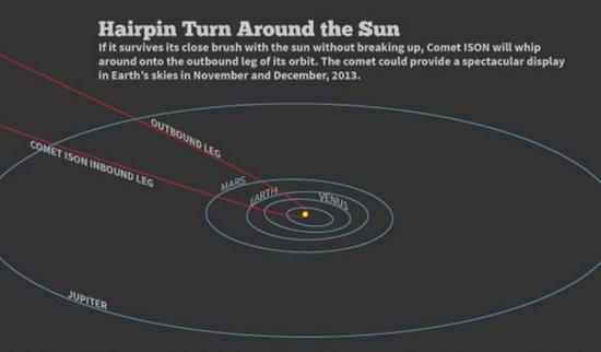 当彗星ISON第一次近距离“沐浴”太阳光时,科学家认为我们依然有希望观测到完整的挥发物抛射,彗核等结构也被列入年底的观测计划中,该彗星的彗尾可绵延数百万公里,这对天文学家而言是个绝佳的观测机会,天空摄影师也可拍摄到壮观的照片。当彗星接近太阳时,其将经受太阳高温的“烤”验,120万公里的近日点意味着该彗星非常接近光球层,炙热的等离子体可产生55万摄氏度的高温,因此彗星ISON能否在太阳的高温烘烤下生存下来也是个疑虑。