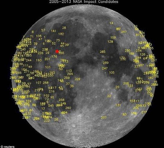 美国宇航局月球监测计划已经记录到数百次撞击事件,3月17日发生的撞击为正方形点的为位置