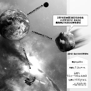 2012 DA14还没和地球亲近,它就受到了大家的关注。因为它是迄今已知的在如此近距离上掠过地球的个头最大的小行星,最近时距离地面仅2.768万公里,这一距离已经低于同步卫星的轨道。在最接近地球时的相对地球的运行速度为每小时28100公里,每秒约7.8公里。“它从南天球向北天球运动。16日凌晨3:25最近,如果它跑着跑着,脱离了自己的轨道,被潮汐力吸引,发生撕裂,冲破地球的大气层,后果不堪设想。足足可以毁掉像伦敦这么大的一座城市。”中科院紫金山天文台研究员王思潮说,2012 DA14的威力相当于500颗广岛原子弹。