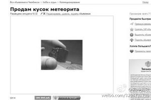 据俄罗斯媒体报道,15日俄罗斯车里雅宾斯克州陨石坠落事件发生后,有网民在一个购物网站上出售所谓的“陨石碎片”。这位网民在商品信息中注明“出售陨石碎片,新的,谢尔盖,车里雅宾斯克”,并开价30万卢布(约合1万美元)。不过这条信息很快被网站删除。