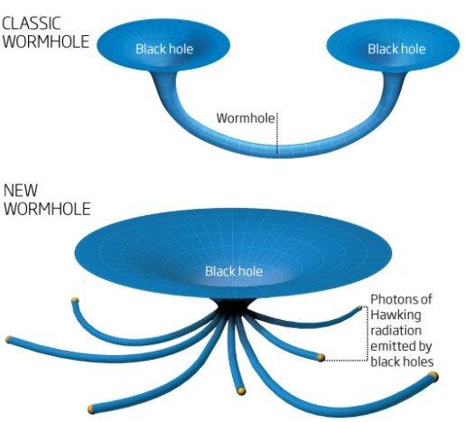 去年,来自加州大学圣巴巴拉分校的研究人员约瑟夫·鲍尔钦斯基和他的同事对黑洞的量子影响进行了研究,发现蒸发黑洞释放的伽玛闪光粒子存在纠缠态的问题,这会导致黑洞事件视界边缘进行一堵“能量墙”,任何落入黑洞的物质会出现“燃烧”,而不是被拉伸成意大利面条。对此,美国斯坦福大学伦纳德·萨斯坎德与普林斯顿高级研究院科学家胡安发现如果虫洞的物理表现中存在纠缠(态)的问题,那么根据广义相对论推到出的“量子黑洞”也存在类似的现象,这种想法扩展到黑洞的霍金辐射领域,就可以延伸出一种新的虫洞。