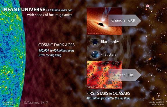 为了更多的了解最早恒星和最初的黑洞,研究小组分别利用美国宇航局钱德拉X射线天文台和斯皮策太空望远镜分析X射线和红外射线信号。钱德拉X射线天文台观测到的X射线很可能来自撞进黑洞的过热物质,研究人员表示。另一方面,斯皮策望远镜检测到的红外射线组成了宇宙红外背景,也即宇宙大爆炸后首批恒星中巨大恒星群发出的光,以及来自黑洞的光,后者在吞噬气体时产生了大量的能量。