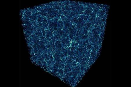 超级电脑对宇宙的模拟。中央明亮物体是一个星系团,质量为太阳的1千万亿倍。占据宇宙大部分质量的细丝间充满了巨型球状空洞。