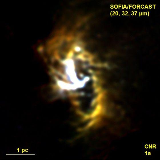 这张照片是SOFIA记载望远镜在2011年的一次观测飞行过程中拍摄的,使用的设备是由康奈尔大学的特里·哈特(Terry Herter)领衔的一个团队研制的“索菲亚望远镜暗淡天体红外相机”(FORCAST)。