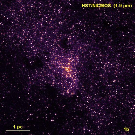 这张照片是哈勃望远镜获取的近红外影像,其所展示的视野和角度都和上一张SOFIA/FORCAST获取的中红外图像相同。在这一波段上,银盘面上大量不透明的尘埃带阻挡了视野,因而无法看到像SOFIA拍摄照片中那样的景象