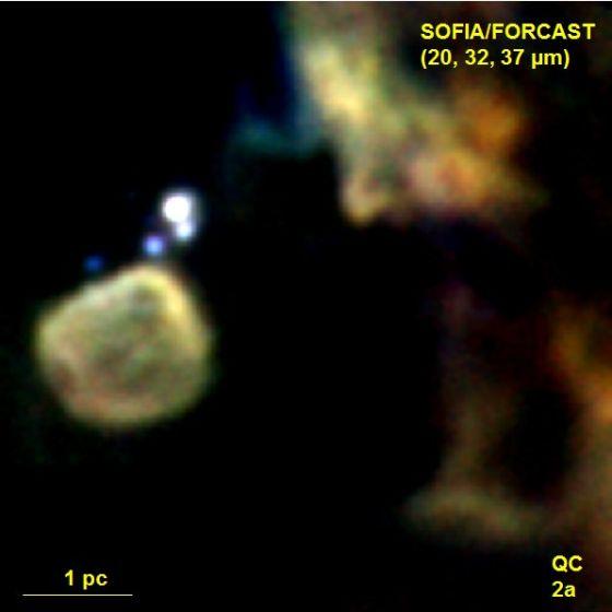 这是SOFIA/FORCAST中红外图像,拍摄的是五合星团,这是一个由年轻恒星组成的星群,在图像中位于左侧边缘,其距离银心大约100光年