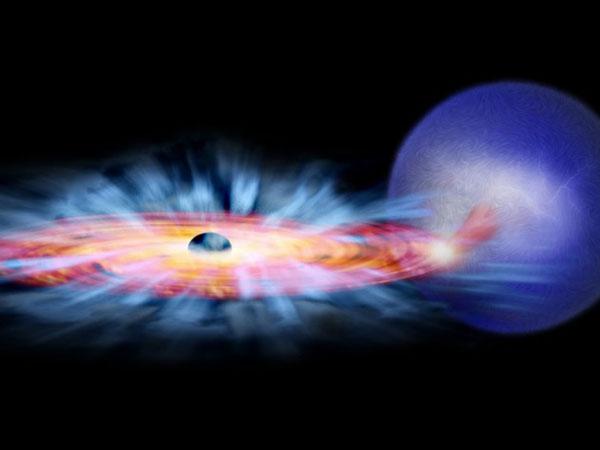在黑洞-恒星系统中,从恒星流出的气体注入黑洞周围的吸积盘中,一边旋转一边接近黑洞。气体在向中心旋进的过程中被加热到极高的温度。