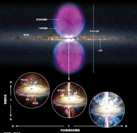 那颗超大质量黑洞,对银河系“郊区”的那些孕育生命的行星的宜居性,又有怎样的影响?在黑洞开启、进食并释放能量的过程中,我们并没有看到它变得多么明亮。不过,从银盘延伸出的巨大而炽热的伽马射线泡来看,的确表明黑洞释放出了巨大能量,但并不朝向我们。即使曾经有过更剧烈的天体活动,那必定也是很遥远的事情,甚至早于太阳系的形成(45亿年前)。从那以后,银心的中央黑洞对银河系“郊区”(比如太阳系)的物理影响变得适中(才有了生命的出现)。