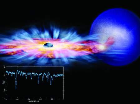 “吞”:由黑洞和正常星球组成的双星系统的X射线光谱表明数百万的气体旋风围绕黑洞在打旋,使大部分的热气以螺旋形向黑洞内部扩展,约有30%的气体被驱散到宇宙中。