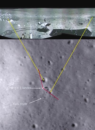这张美国航天局提供的拼版照片显示的是嫦娥三号着陆器拍摄到的月面图像(上)与美国“月球勘测轨道飞行器”拍摄到的月面图像。黄色箭头指示的是两张照片中陨坑的对应位置,红线指示的是嫦娥三号着陆器拍摄图像的大概视角范围。
