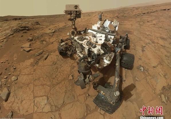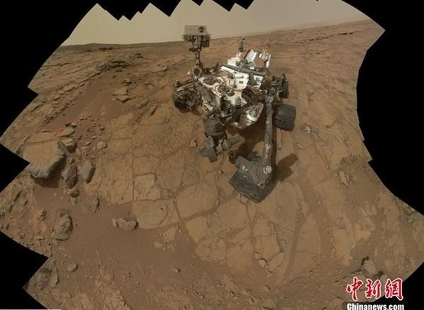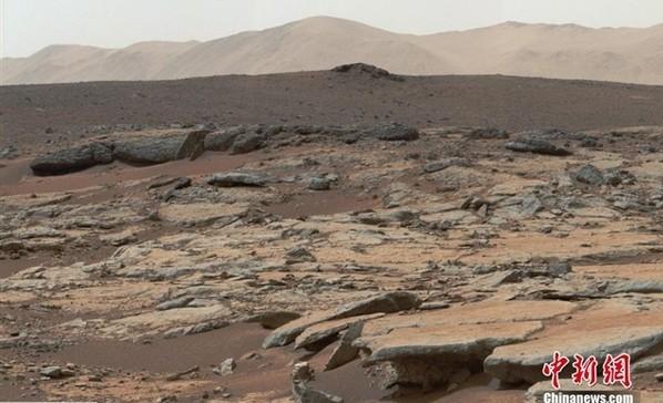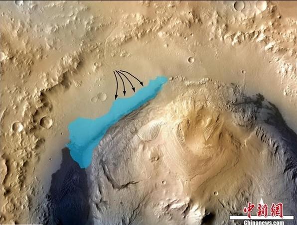 2013年12月9日,NASA公布的“火星好奇号”机器人拍摄到的火星盖尔环形山图片以及NASA绘制的模拟图。科学家表示,好奇号在附近进行勘探并且发现可能存在水的可能;虽然没有直接找到水,但科学仪器表明可能性非常大。