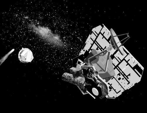 撞击器击中彗星的彗核后,会在其表面轰出“弹坑”,使其内部物质暴露出来供研究。据预测,撞击会造成彗核表面的冰雪、尘埃等溅起,好比在太空中放出一个大“焰火”。