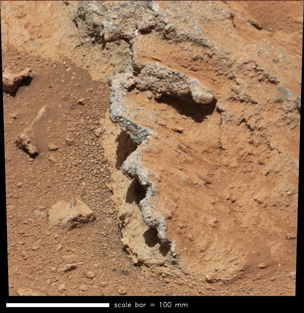 “我们能够发现泥板岩非常了不起,” 好奇号科学小组成员、美国亚利桑那图森行星科学研究所的艾琳·尹思特(Aileen Yingst)这样说道。“泥板岩意味着岩石内部有非常精细的颗粒,这意味着这些细粒沉淀的非常慢。在地球上,这一般是由风或者水引起的。我们认为很可能是水。”