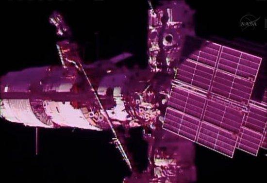 国际空间站外,一位宇航员在骑在起重机吊臂上进行工作。