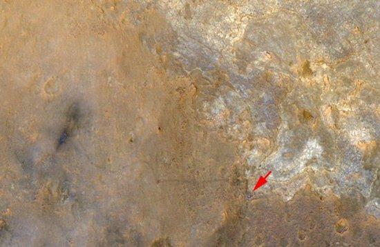 火星侦察轨道器捕捉到地面行驶的好奇号火星车、登陆时抛弃的火箭发动机以及车轮轨迹等