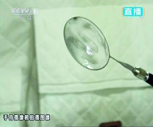 实验过程:王亚平打开一个饮水袋,由于失重的原因,水并不往下流。随后,王亚平把一个金属圈插入饮用水袋中,慢慢抽出金属圈,形成一个水膜。晃动金属圈,水膜也没有破裂;往水膜表面贴上一片画有中国结图案的塑料片,水膜依然完好。
