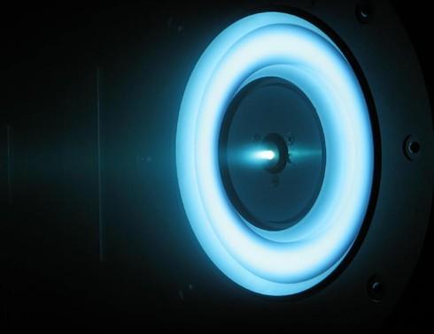 新科学家报道,近日美国宇航局发布了最新的高科技太空飞船引擎,这个发出蓝色火焰的引擎使用了氙离子而非导弹爆炸。图片显示了真空室里白蓝色舷窗里小小的蓝色喷气推进器,科学家就是在这里——美国宇航局加州帕萨迪纳喷气推进实验室里对其进行测试的。蓝色发光来自于粒子离开发动机失去能量后释放出的光子。